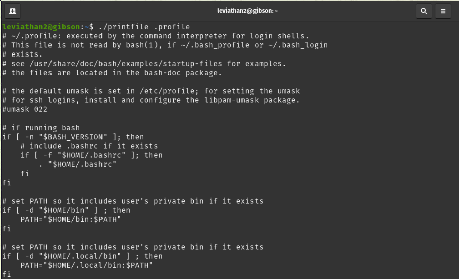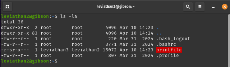 Listing the files and folders of the home folder we can see a binary SUID executable printfile which is owned by the user leviathan3.